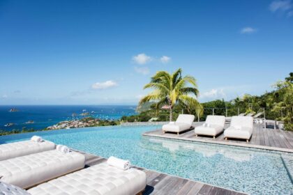 Luxury infinity pool at a St Barts villa with cushioned white loungers, palm tree, and panoramic ocean views.