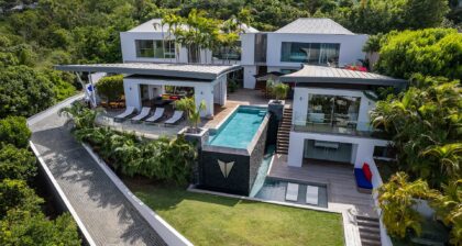 This stunning honeymoon villa features a sculptural, wing-like design that seems poised to soar over the bay. Spanning three levels, its open layout seamlessly connects indoor and outdoor spaces, while glass walls offer views of Saint Jean from almost every angle. The villa showcases clean lines, custom finishes, and a carefully curated palette of natural tones, resulting in a refined yet welcoming aesthetic that is complemented by lush landscaped surroundings.